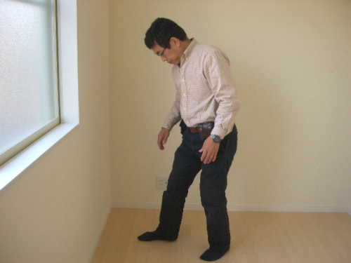 そして、触診は手でするものとは限りません。床の状態を足で確認している様子です。このときはスリッパを脱ぎ(もしくは元々はかない)、足裏で確認しています。床鳴りや床の沈みなどを確認しているところです。
