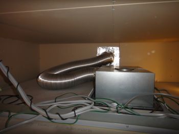 上の写真は浴室の天井点検口から天井裏を見たところです。換気扇やダクトの取り付け状態は見ておきたいポイントで、年に何度かダクトが外れている(未接続)状態が見つかっています。今回の物件では問題はありませんでした。
